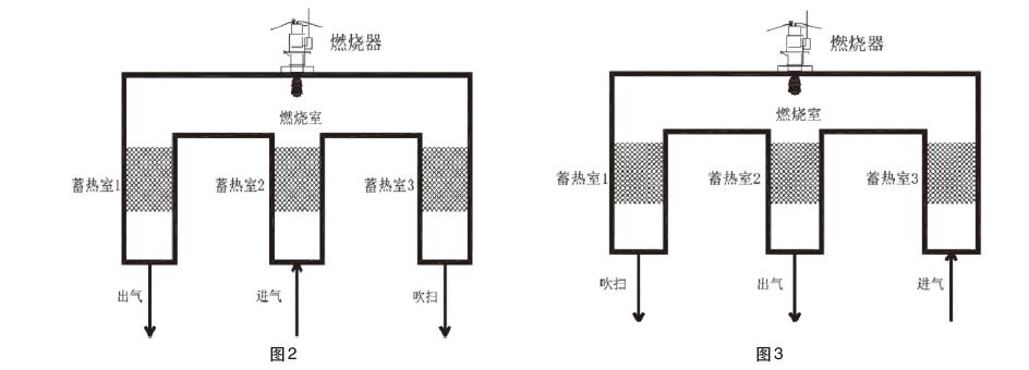 待蓄熱室3里面蓄熱體熱量吸附飽和后,切換閥進(jìn)行切換,如圖2所示。廢氣進(jìn)入蓄熱室3,經(jīng)過高溫預(yù)熱后,進(jìn)入燃燒室,從蓄熱室2出,熱量為蓄熱室2所吸收,直至蓄熱室2吸附飽和,開始切換。如圖3所示進(jìn)入下一個(gè)流程,3次切換為一個(gè),如此運(yùn)行。RTO切換閥切換時(shí)間,一般為60s-120s,切