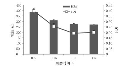 2.1.3研磨時(shí)間的篩選稱取BRE原料藥7.5g,置于含有吐溫80(1.125g)的水溶液(22.5mL)中,攪拌混懸,加入氧化鋯珠(粒徑為0.6mm)450g,分別研磨0.5、0.75、1.0、1.5h,制備3批BRE納米晶混懸液。以BRE納米晶混懸液的粒徑、PDI為指標(biāo),篩選研磨時(shí)間。結(jié)果,隨著研磨時(shí)間的延長(zhǎng),BRE納米晶混懸液的粒徑、PDI逐漸減??;研磨0.5、0.75、1.0h時(shí),BRE納米晶混懸液的粒徑、PDI減小的幅度較大;研磨1.5h時(shí),BRE納米晶混懸液粒徑雖然較研磨1.0h時(shí)的粒徑減小,但減小幅度不大。綜合考慮能耗和時(shí)間,確定研磨時(shí)間為1h。研磨時(shí)間的篩選結(jié)果見(jiàn)圖3。